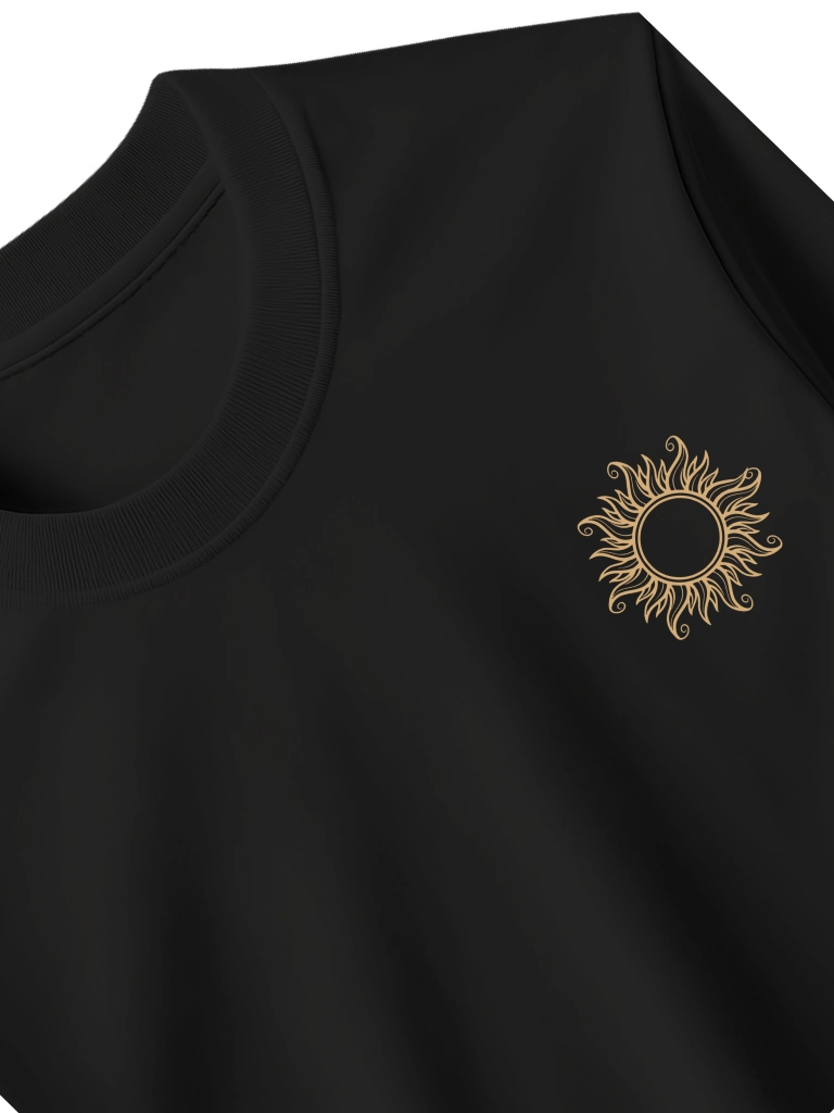Minimal sun symbol on the front with a detailed temple chariot artwork on the back.